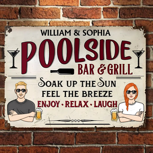 Poolside Bar & Grill Soak Up The Sun Feel The Breeze - Personalized Horizontal Metal Sign - Gifts For Couple