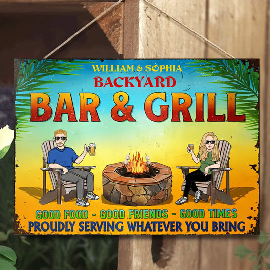 Bar & Grill Proudly Serving Whatever You Bring - Personalized Horizontal Metal Sign - Gifts For Husband Wife, Family, Couples