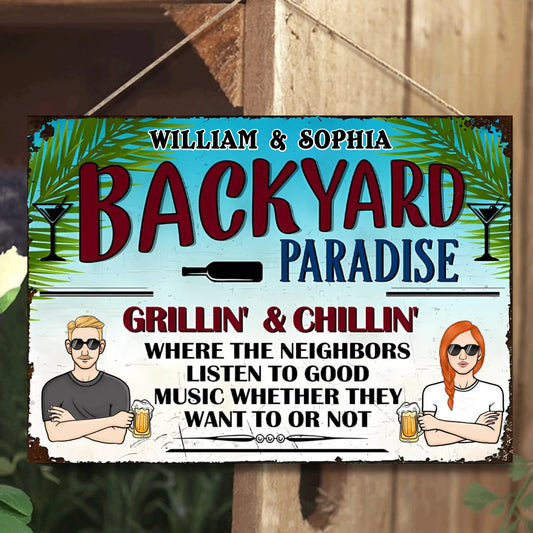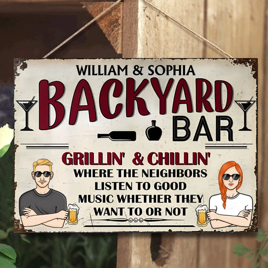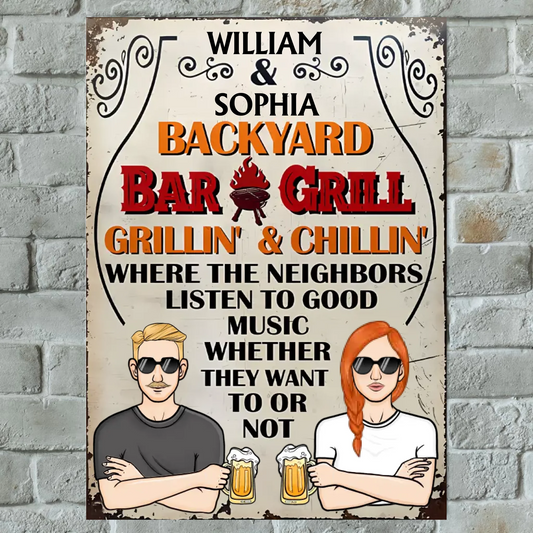 Backyard Bar & Grill Where The Neighbors Listen To Good Music - Personalized Vertical Metal Sign - Gift For Husband Wife, Couples, Family