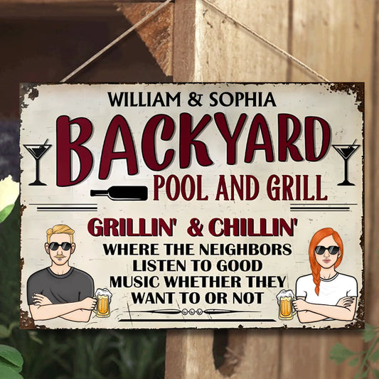 Backyard Pool & Grill Listen To Good Music - Personalized Horizontal Metal Sign - Gifts For Couple