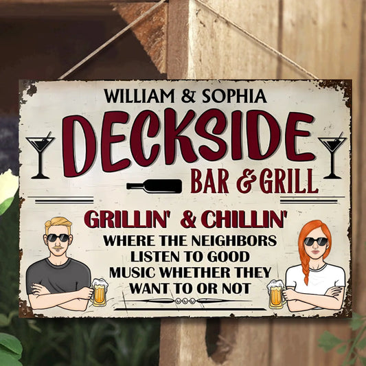 Deckside Bar & Grill Listen To Good Music - Personalized Horizontal Metal Sign - Gifts For Couple, Family