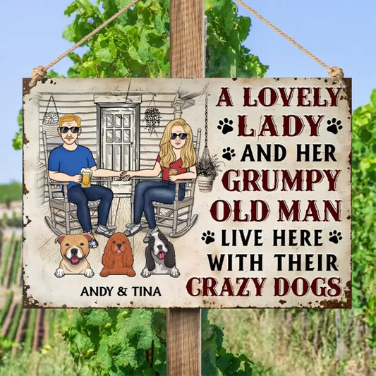 Family Couple A Lovely Lady And A Grumpy Old Man Live Here With Their Crazy Dogs - Personalized Horizontal Metal Signs
