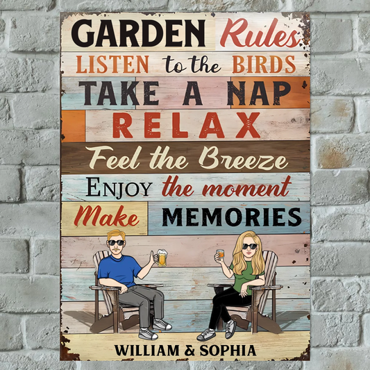Garden Rules Listen To The Birds Husband Wife Couple - Personalized Vertical Metal Sign
