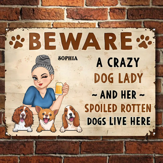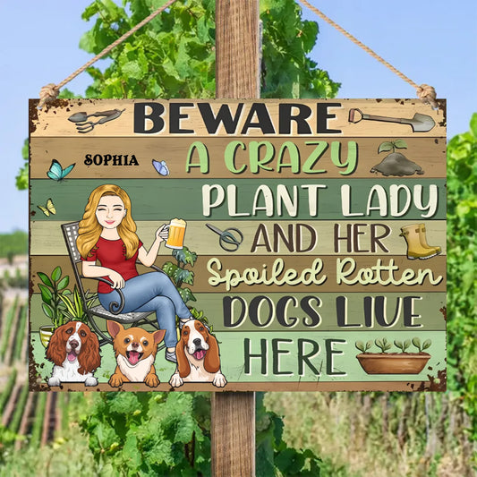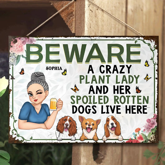 Beware A Crazy Plant Lady & Her Spoiled Rotten Dogs Live Here - Personalized Horizontal Metal Sign