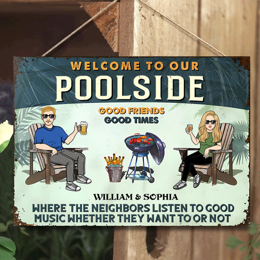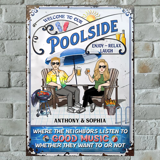 Poolside Listen To The Good Music - Personalized Vertical Metal Sign - Gift For Couples, Family
