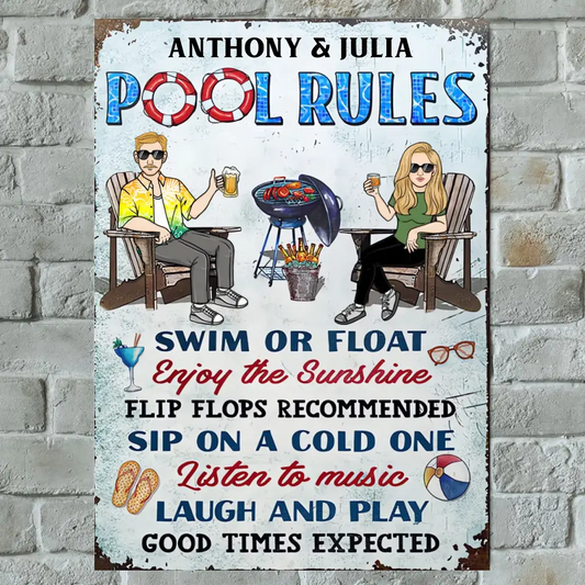 Pool Rules Swim Or Float Grilling Couple Husband Wife - Personalized Custom Classic Metal Signs