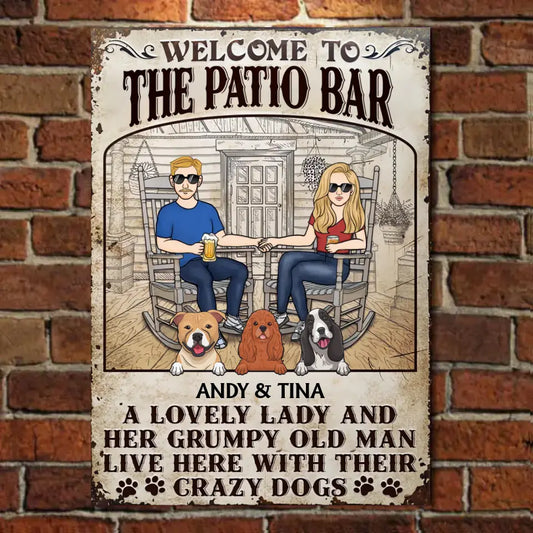 Patio Dog Couple A Lovely Lady And A Grumpy Old Man Live Here - Personalized Vertical Metal Sign