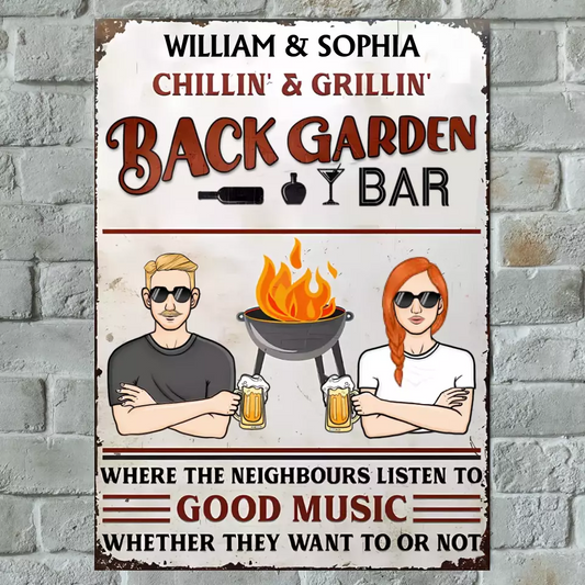 Back Garden Bar Grilling Listen To Good Music - Personalized Custom Classic Metal Signs