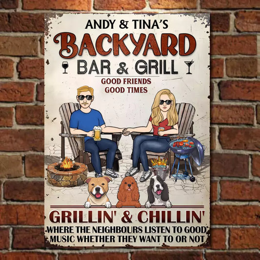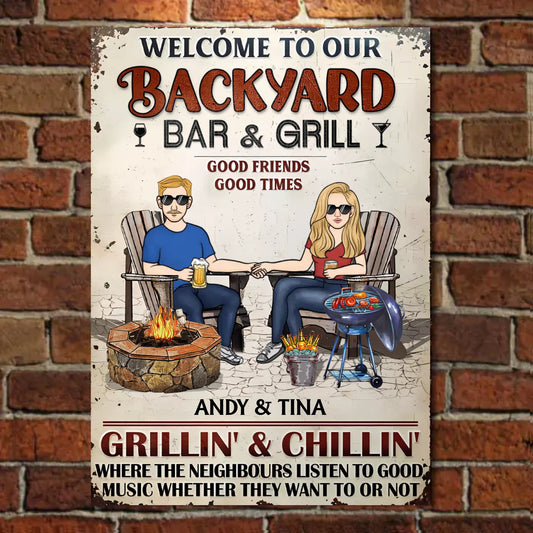 Backyard Bar&Grill Where The Neighbours Listen To Good Music Whether They Want To Or Not - Personalized Vertical Metal Sign