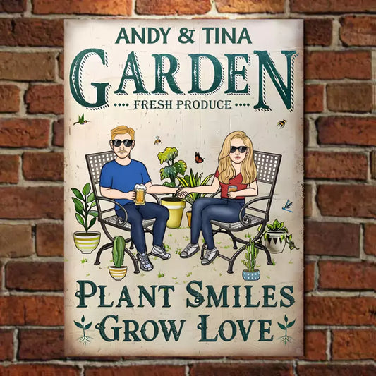 Gardening Couple Plant Smiles Grow Love - Personalized Horizontal Metal Sign