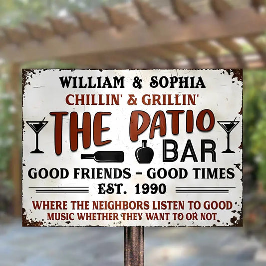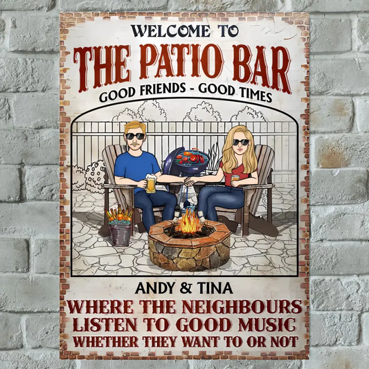 Patio Bar Family Couple Where The Neighbours Listen To Good Music - Personalized Metal Sign
