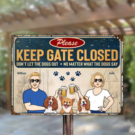 Keep Gate Closed Don't Let The Dogs Out - Couple And Dogs - Personalized Horizontal Metal Sign
