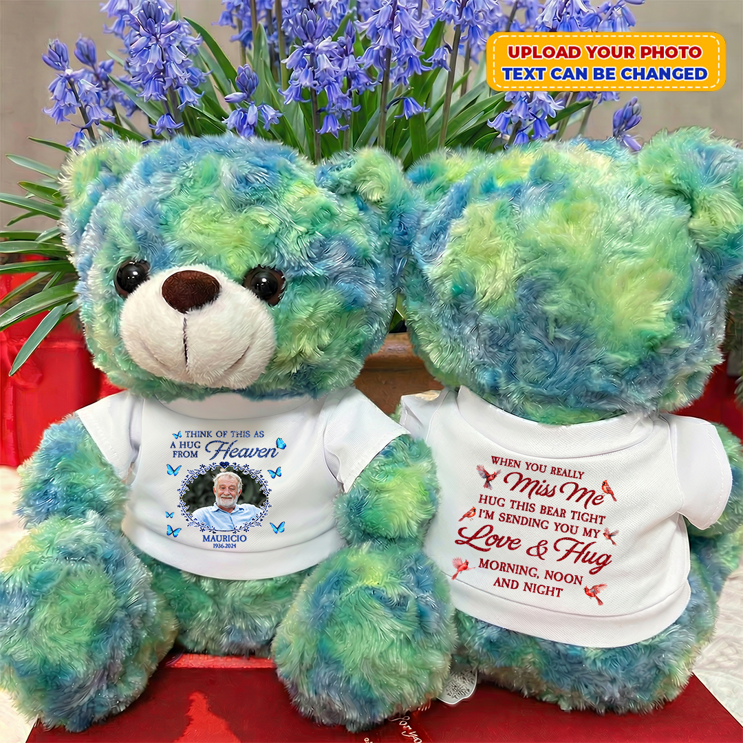 This heartfelt memorial bear is a comforting keepsake for those who miss someone special. Personalized with a photo and name, it features the touching message: “Think of this as a hug from Heaven.” A beautiful way to keep their memory close, this bear offers warmth and love when words aren’t enough.