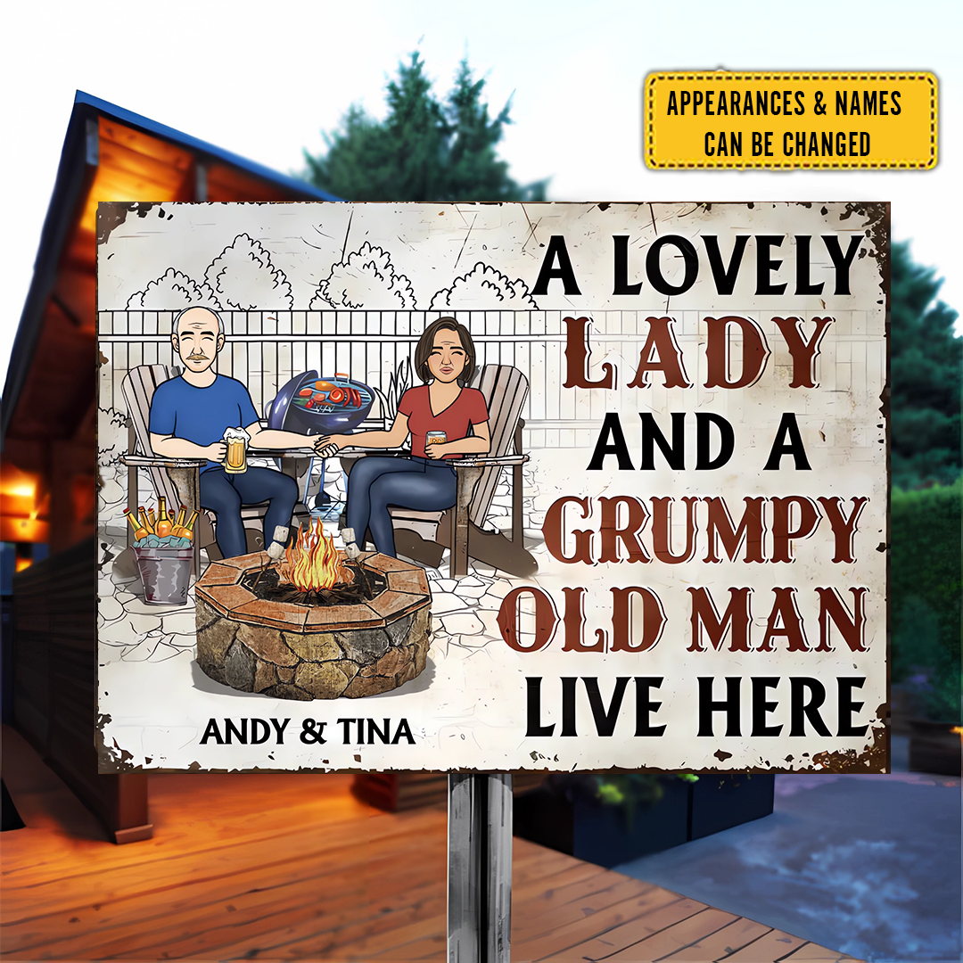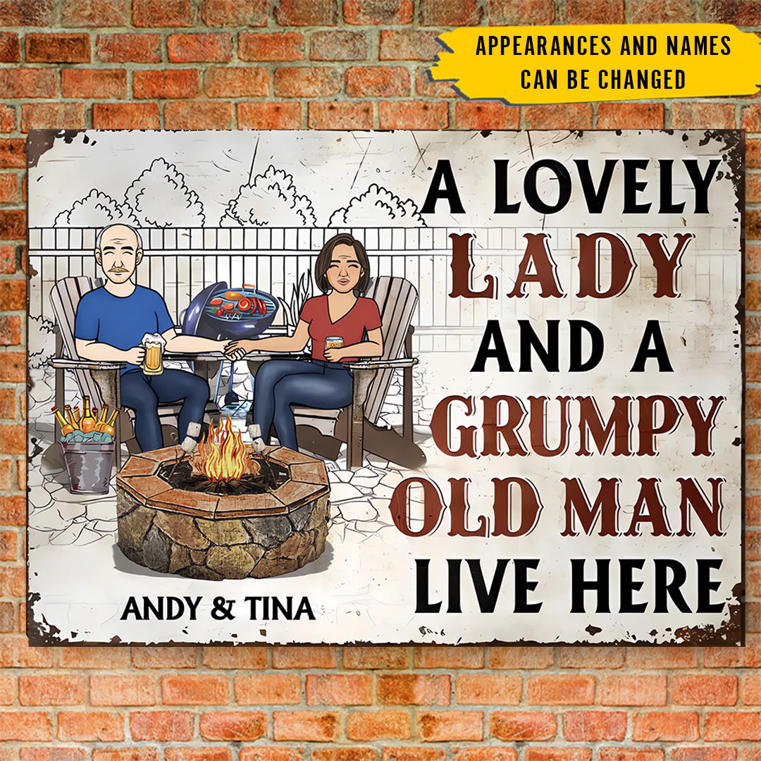 Couple A Lovely Woman And A Grumpy Old Man Live Here - Personalized Horizontal Metal Sign