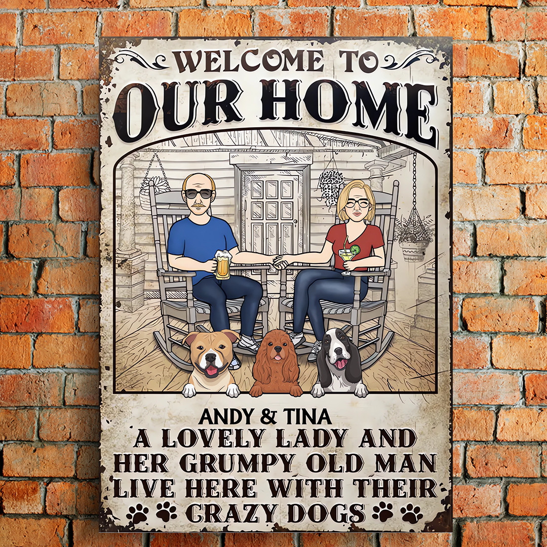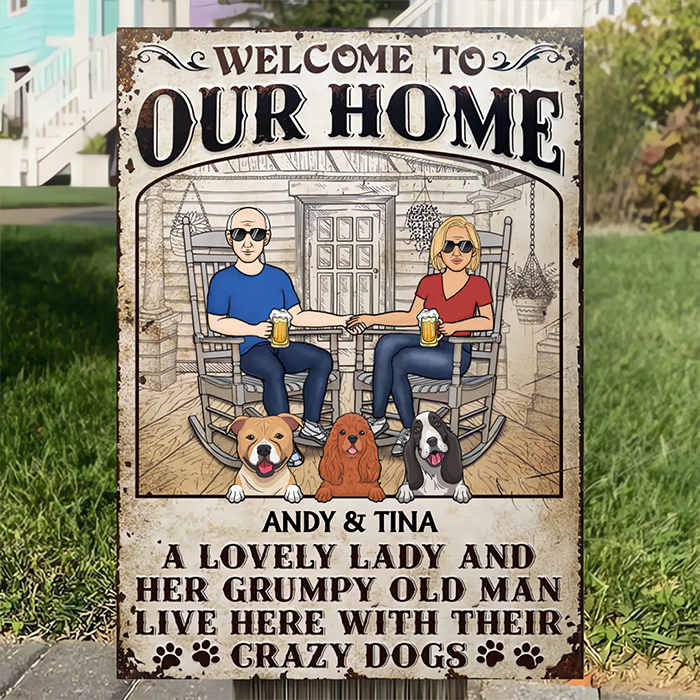 Dog Couple A Lovely Lady And A Grumpy Old Man Live Here - Personalized Vertical Metal Sign