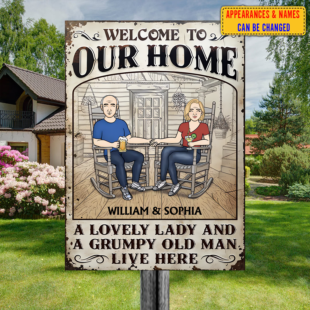 Welcome To Our Home A Lovely Woman And Grumpy Man Live Here - Personalized Metal Sign