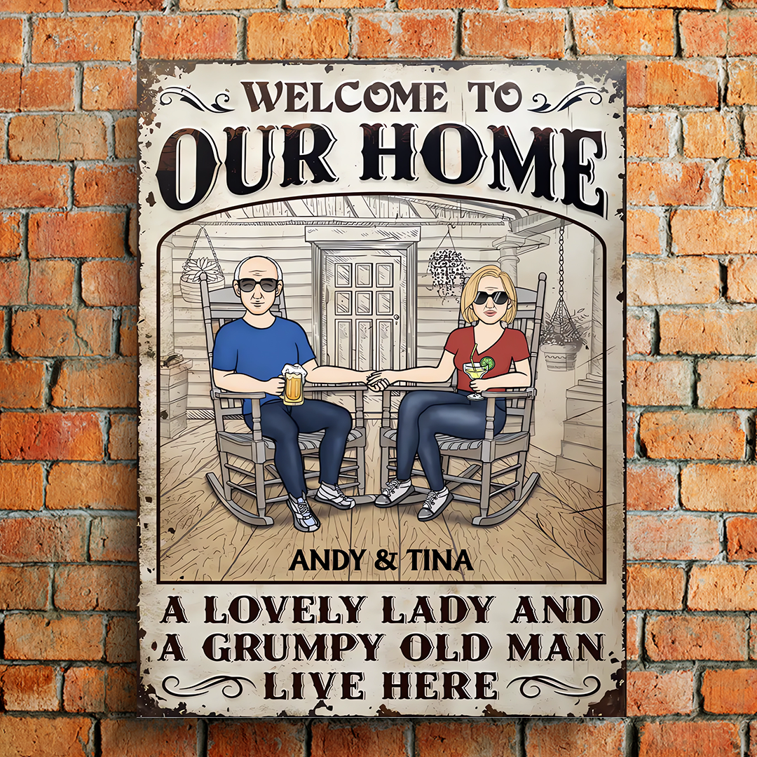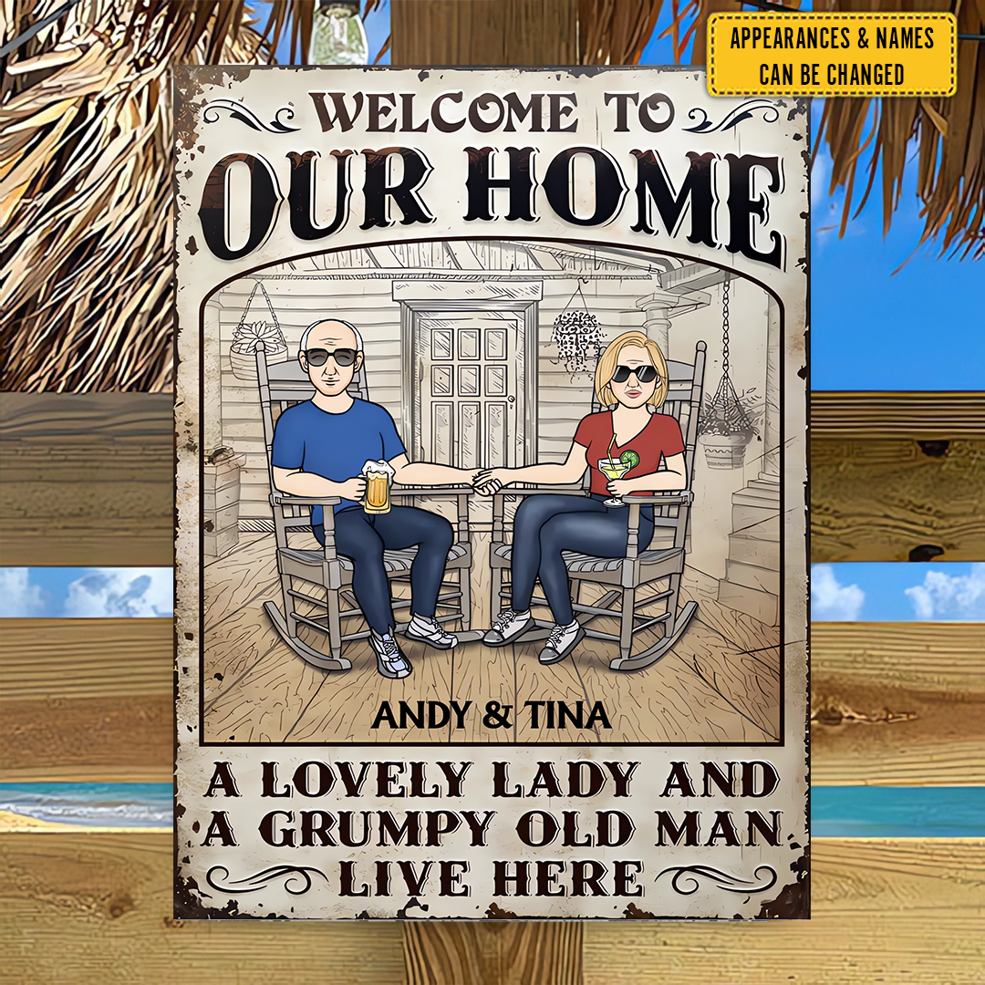 Welcome To Our Home A Lovely Woman And Grumpy Man Live Here - Personalized Metal Sign